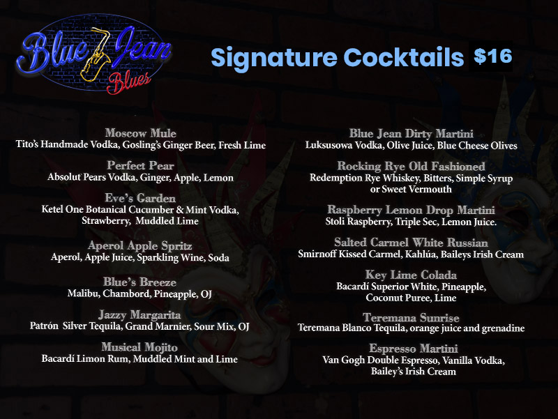 Signature Cocktails $16Rick Yontz2025-03-19T11:11:10-04:00 Happy HourEvery Day 4 -7 PM1/2 Off Domestic Beer, House Wine & Well Drinks Our Wine List Live MusicEvery Day of the WeekMake Your Table Reservation Two Drink Minimum Please enjoy our broad selection the cocktails, Wines and Beverages during the daily performance schedule, provided for your enjoyment! Go To Our Calendar Pizza Done Right!Hot & DeliciousEnjoy!!! See Our Full Menu [wr_vc_title rs_title_style=”st2″ big_title=”Signature Cocktail Menu”]